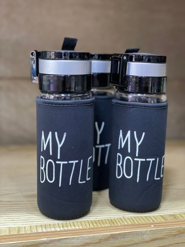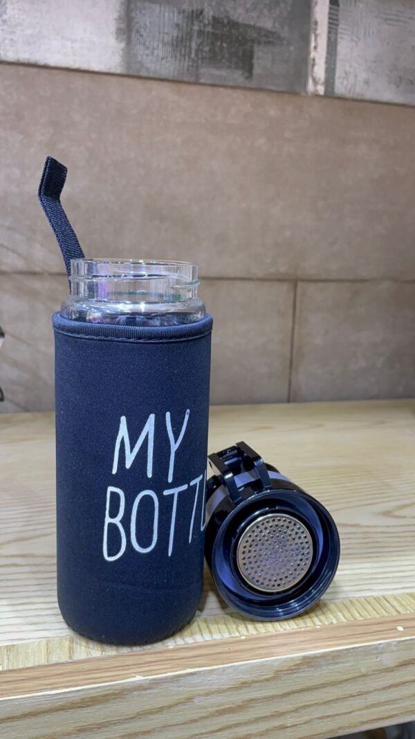 Bouteille en verre de 500 ml avec couvercle en inox, petit filtre intégré et housse isolante. Élégante, pratique et parfaite pour une hydratation saine au quotidien.